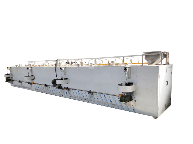 全自動平面回轉(zhuǎn)烤爐主要用于堅果炒貨及籽類產(chǎn)品裹衣裹粉后的烘烤加工。采用直燃式加熱方式,熱量直接作用于食品上,烘烤香味更濃郁,并通過設(shè)備的搖擺避免食品粘連變形。具有烘烤口味色澤優(yōu)良, 沒有污染等特點(diǎn)。
